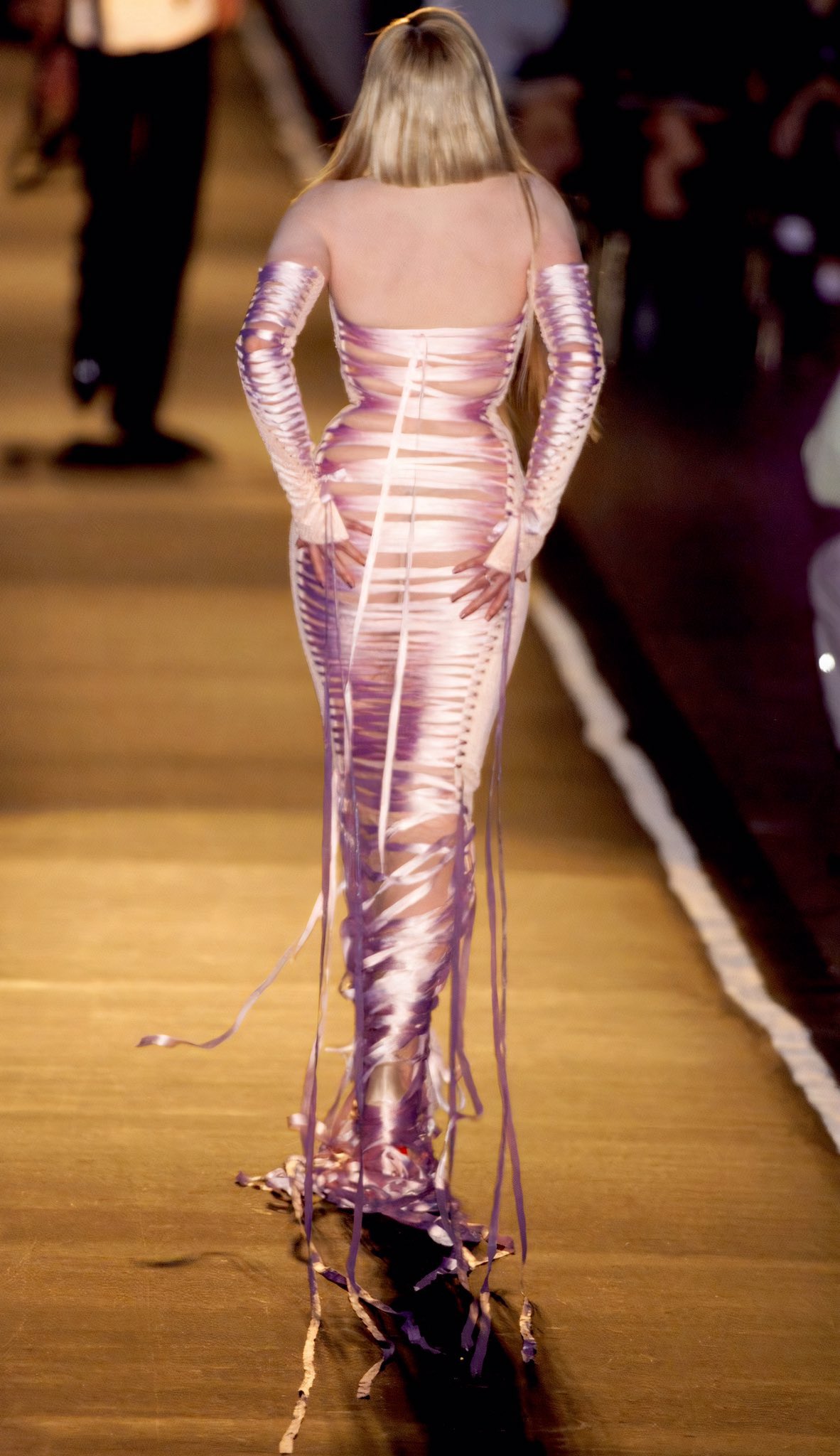 Теперь кутюрными коллекциями Gaultier Paris занимается не сам Жан-Поль, а приглашенные дизайнеры. Над сезоном весна-лето 2022 работал Гленн Мартенс, дизайнер Y/Project и с недавнего времени креативный директор Diesel. Он интерпретировал мегахиты Готье разных лет: нежные шифоновые платья отсылают к образам коллекции 1996 года, ленточные корсеты — к кутюру Готье 2001-го, а знаменитая тельняшка расшивается сотнями искусственных кораллов. В этих знаковых для Jean Paul Gaultier элементах узнается почерк Гленна Мартенса — выдают вытянутые силуэты и сложные конструкции: высокая пройма боди, дополнительный объем на бедрах, рваные вырезы и закрученные юбки.