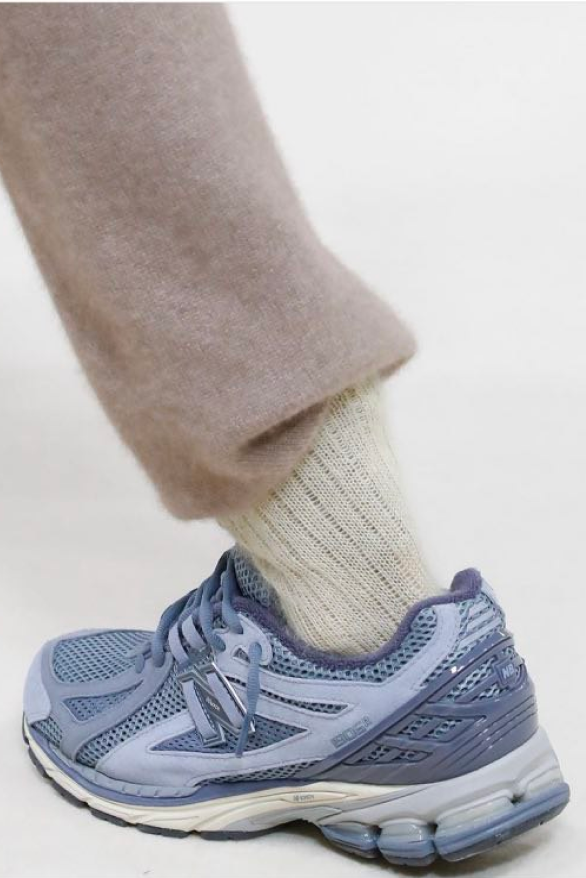 Особенно круто получится, если и носки, и брюки будут максимально уютными: брюки, например, мягкие кашемировые, носки — пушистые. На показе Auralee, который стилизовала Шарлотт Коллетт, в носки также заправляли треники и фланелевые брюки, напоминающие пижамные.